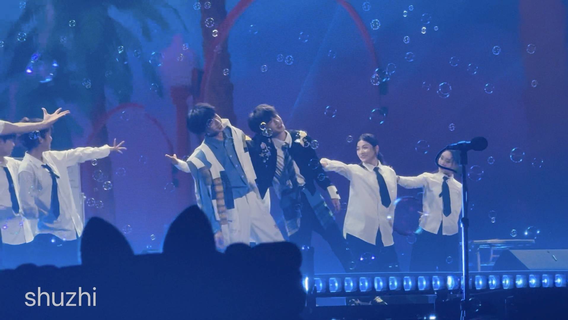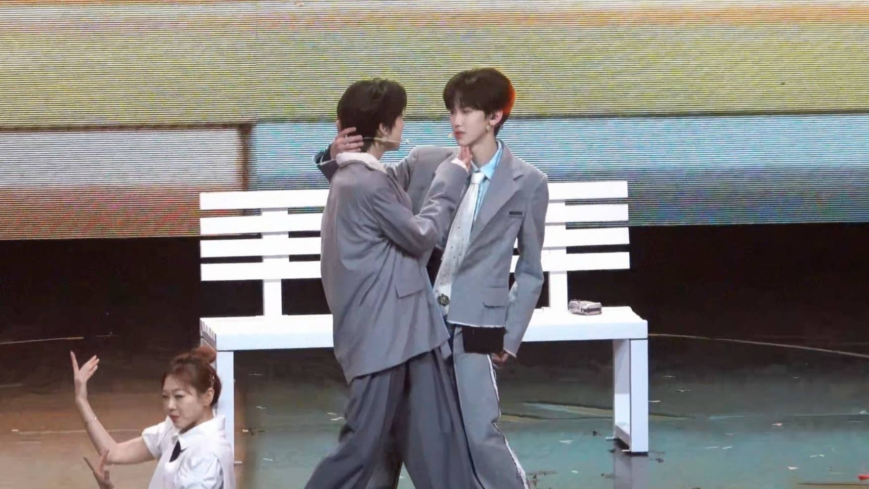 熟悉杨博文的粉丝都知道,这位被冠以“四代第一主舞”的少年向来有肢体接触防御机制。此前在练习室花絮中,当其他队友试图搭肩时,他会下意识侧身避开;就连工作人员调整麦位时,他也会保持礼貌性距离。但面对左奇函时,这种“结界”似乎完全失效——从澳门演唱会后台的咬耳朵私语,到情人节物料里的手指缠绕比心,两人的互动总能精准踩中粉丝的心跳节拍。更耐人寻味的是,这段视频实际拍摄于2月14日,左奇函的条纹裤与杨博文的星星挂链,被显微镜女孩们解读为“情侣装密码”。